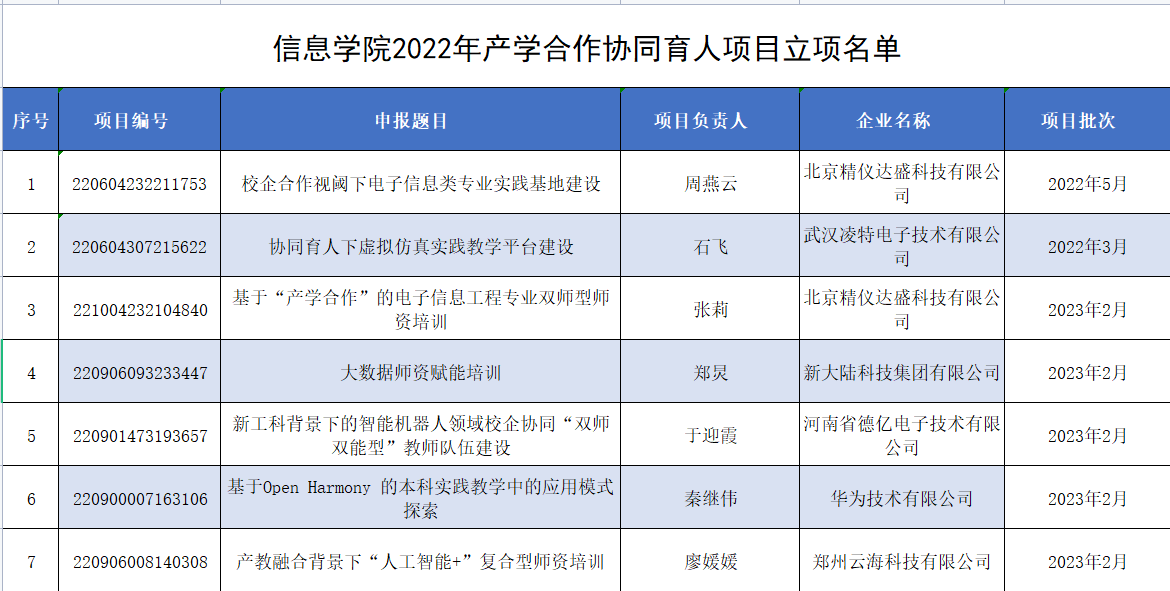 近日,教育部高等教育司发布了《关于公布2022年第二批产学合作协同育人项目立项名单的通知》(教高司函〔2023〕1号),新疆大学信息科学与工程学院获批5项教育部2022年第二批产学合作协同育人项目。至此,学院2022年教育部产学合作协同育人项目立项数达7项,获批数量创历史新高。