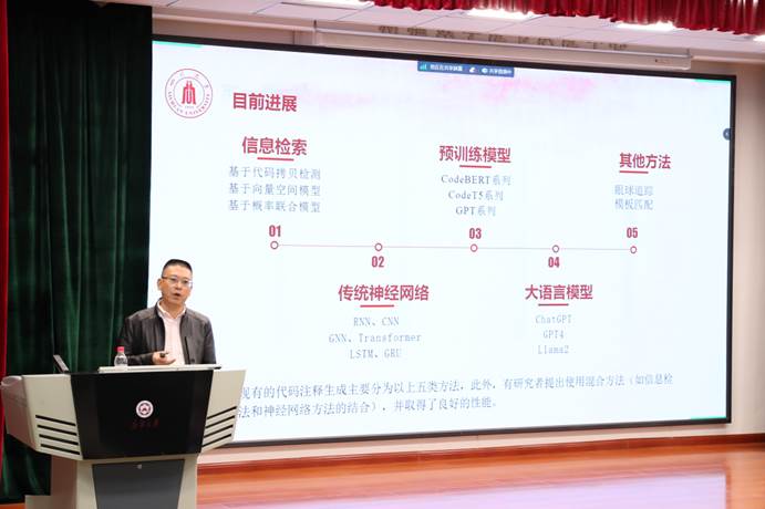 本次活动第三位讲者是CCF高级会员,CCF信息系统专委会常务委员,四川省生物信息学会智慧护理专委会副主任,四川大学计算机学院琚生根教授。琚教授主持四川省人工智能重大专项、四川省重点研发、国家自然基金重点项目课题、国家重点研发课题等各类项目10多项,发表学术论文100多篇,授权发明专利18项。获得省部级以上教学成果奖2项。琚教授的报告题目为:“代码注释生成进展与挑战”。